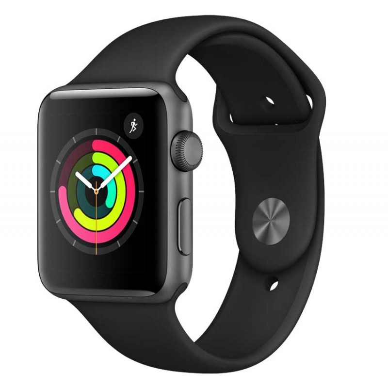 Apple Watch Series 3 42 mm (GPS) avec bande sport noire - Ecran: 1,65" OLED Tactile en Verre Ion-X ( 390 x 312 pixels ) - Boîtier en aluminium argenté - Système d'exploitation: WatchOS 4 - Processeur: double c?ur - Mémoire RAM: 768 Mo - Capacité: 8 Go - Moniteur de fréquence cardiaque - GPS et GLONASS intégrée - Capteurs: Accéléromètre, altimètre, baromètre, boussole, gyroscope, fréquence cardiaque, capteur de lumière - Connectivité: Wifi 802.11 b/g/n et Bluetooth 4.2 - Système d'exploitation compatible: iOS11 et Plus - Étanche jusqu?à 50 mètres - Autonomie de Batterie: Jusqu'à 18 heures - Dimension: 42.5 x 1.14 cm - Poids: 34 g - Couleur: Space Gray -